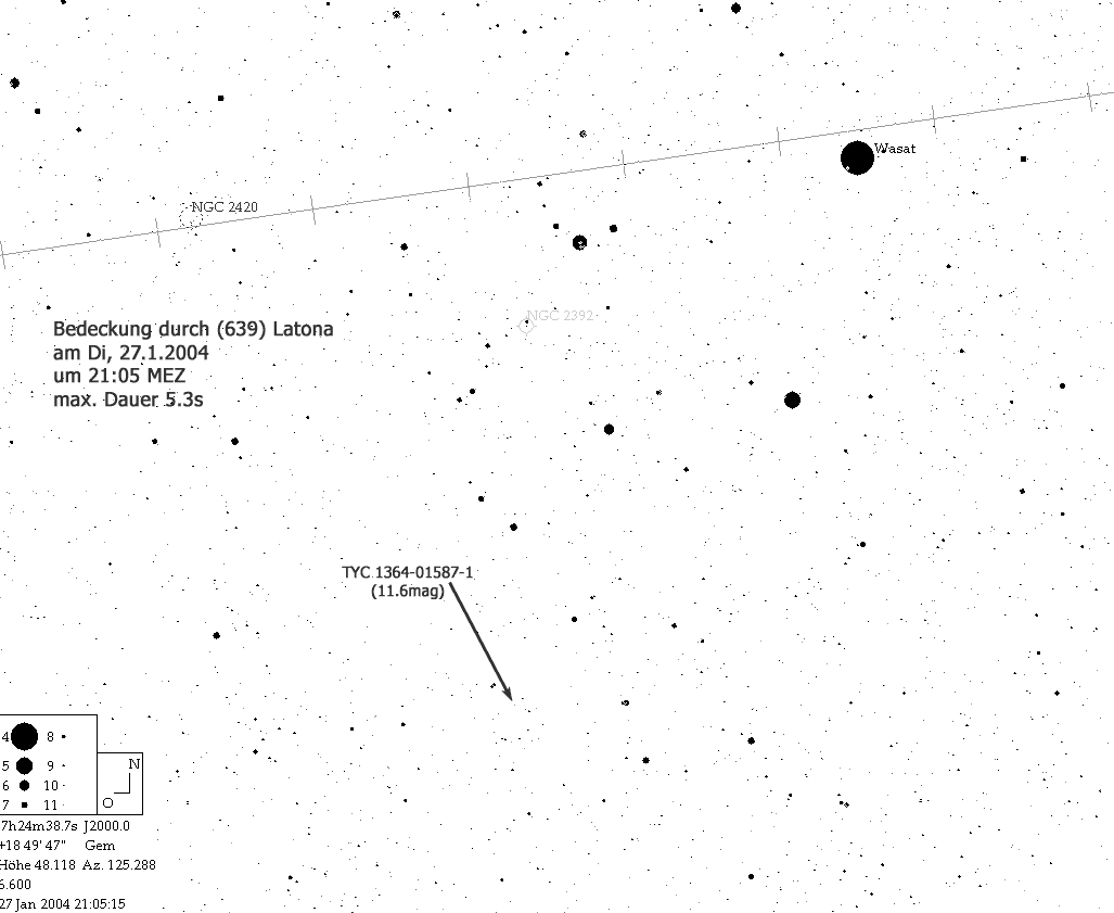 20:03 bis 20:11 UT Asteroid: (2104) Toronto, 16.6mag Stern: 9.3mag Helligkeitsabfall: 7.3mag max. Bedeckungsdauer: 1.5s |