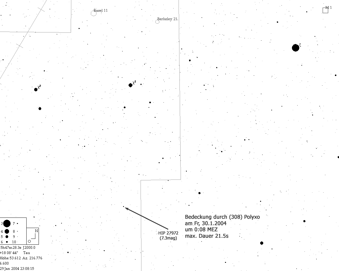 23:00 bis 23:24 UT Asteroid: (308) Polyxo, 12.7mag Stern: 7.3mag Helligkeitsabfall: 5.4mag max. Bedeckungsdauer: 21.5s Eine Aufsuchkarte gibt es hier. |